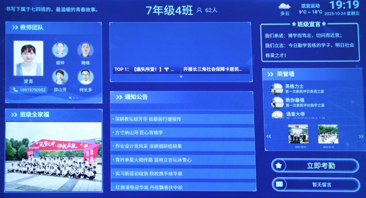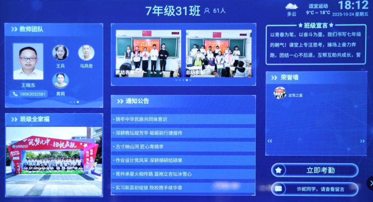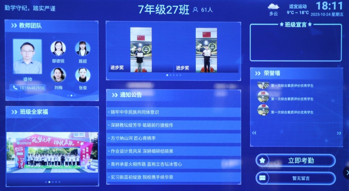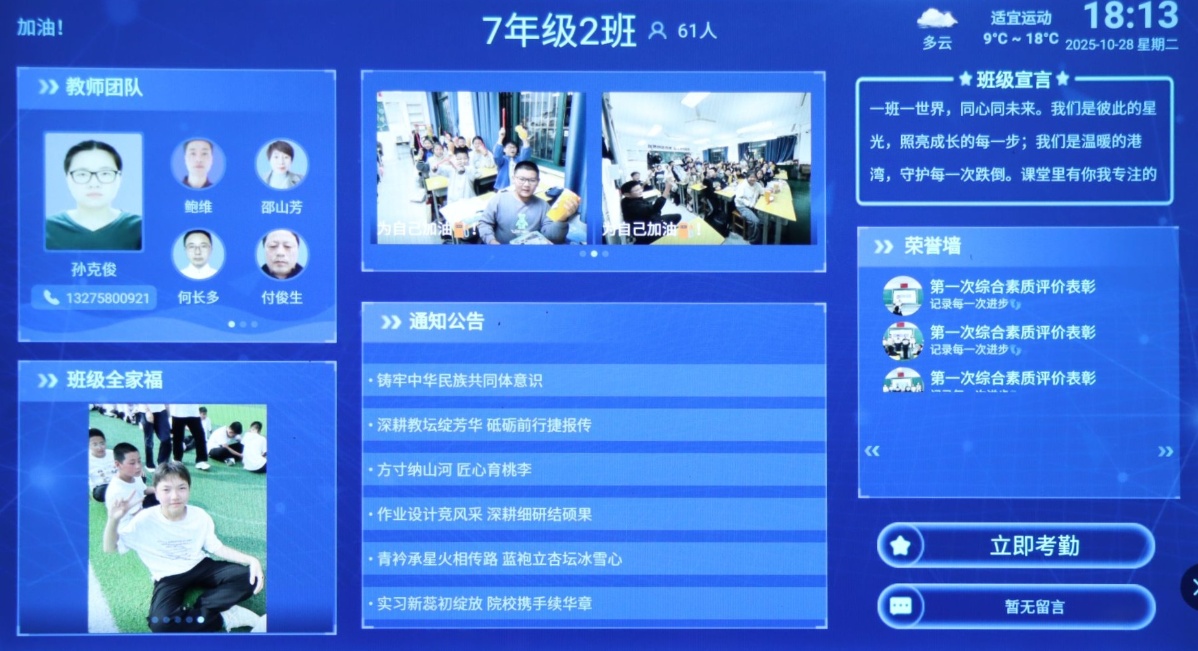 智慧班牌不仅是展现特色班级文化的窗口,更是各班级日常管理的得力助手。智慧班牌的“考勤打卡”功能便捷高效,学生刷脸即可完成考勤,系统实时记录;家长可以通过手机端微信公众号“天云智慧校园”系统,远程查看孩子早、午到校签到时间;班主任查看考勤记录,可以更高效地了解学生出勤状况,进行班级管理。家长还能通过“天云智慧校园”直接给孩子发送留言,学生刷社保卡即可解锁专属留言板,接收、查看并回复留言。“家长留言”功能确保了家长与孩子之间的及时、便捷沟通,实现了家校互通无障碍,助力学校落实“五项管理”,加强手机管理,全面提升育人质量。