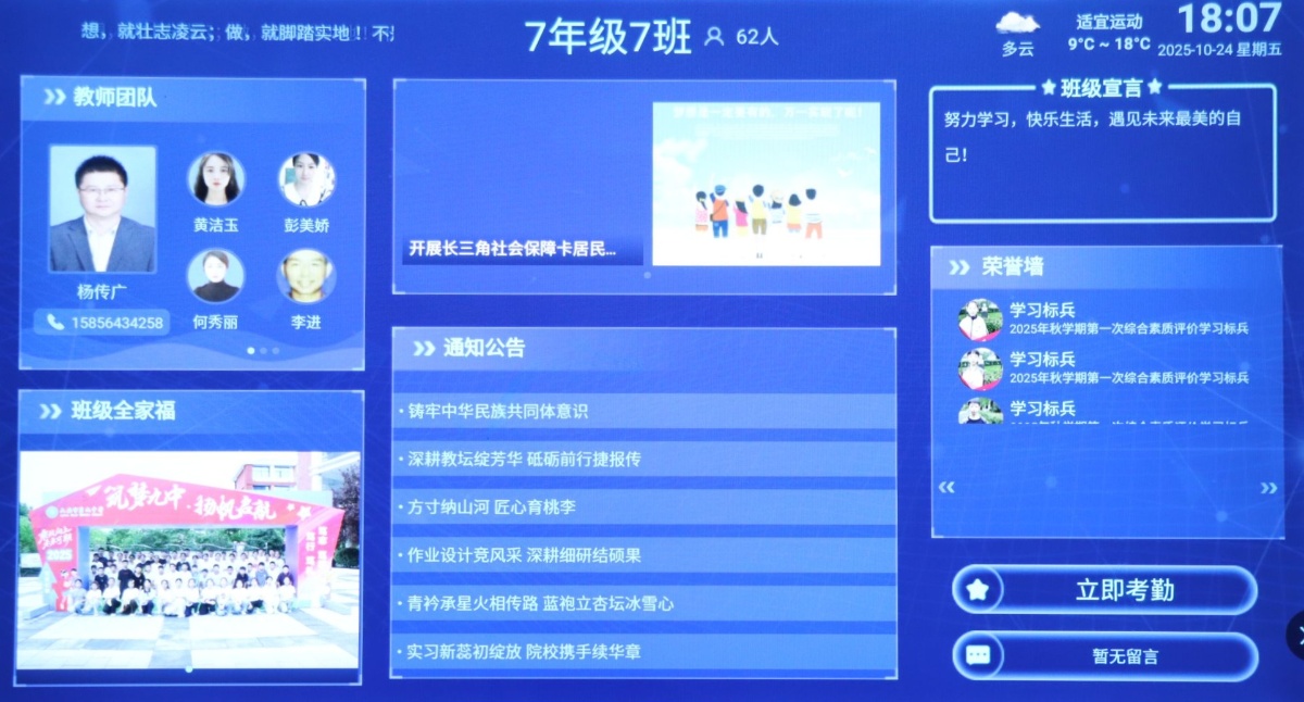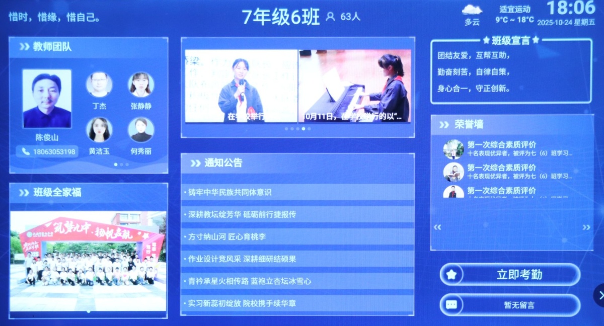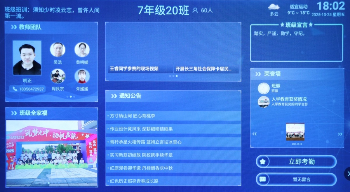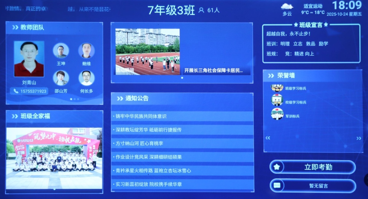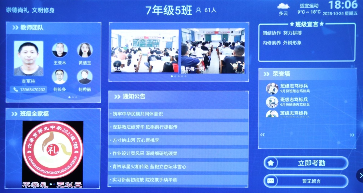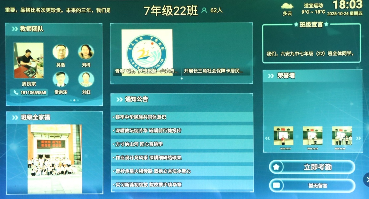 六安九中作为安徽省智慧校园实验校,始终高度重视“环境育人”与“智慧校园”建设,积极尝试新科技、新方法、新手段。此次电子班牌评比活动,彰显了六安九中班级智慧管理与智慧校园建设与“科技引领”的深度融合,有助于推动各班级常态化使用电子班牌,使其成为班级宣传的窗口,真正实现校园文化建设的信息化、多样化与智慧化,让电子班牌成为六安九中校园文化的一道亮丽风景线。(文:张丽莉 图:刘欢 )