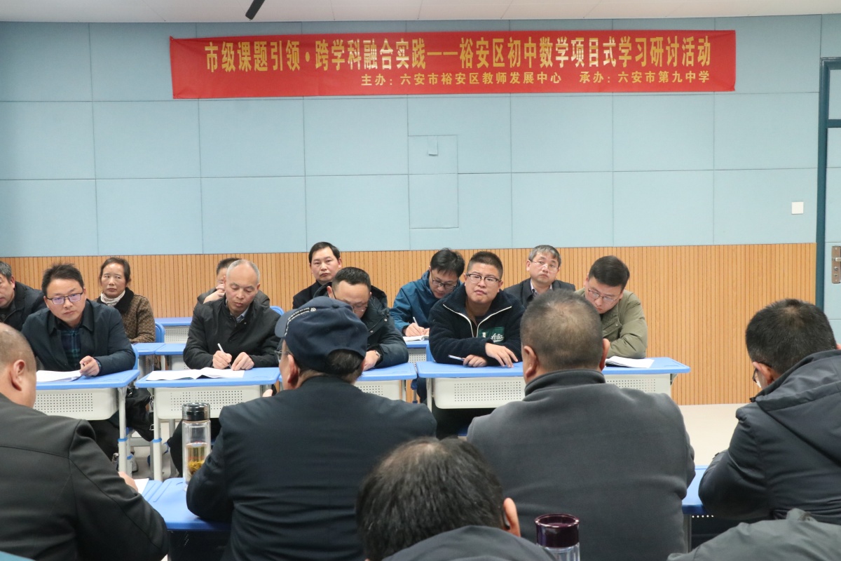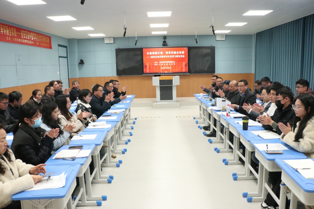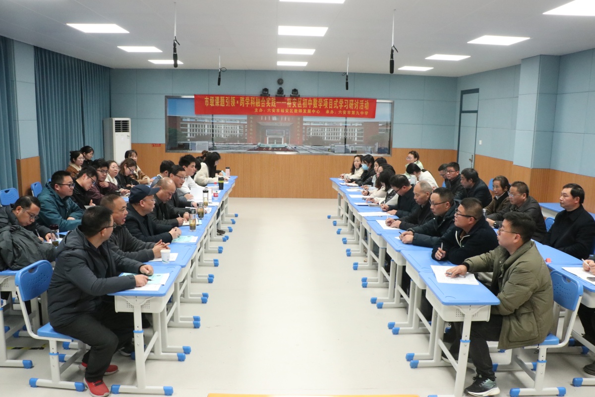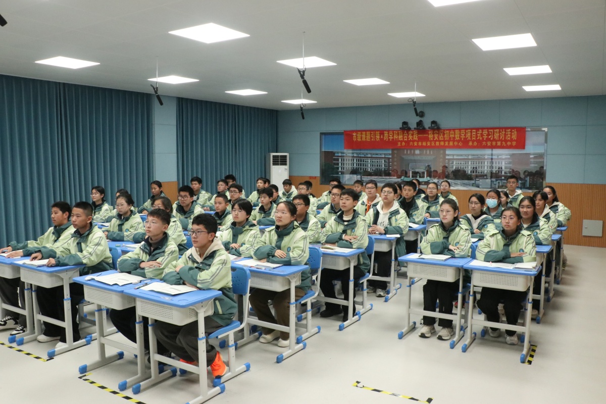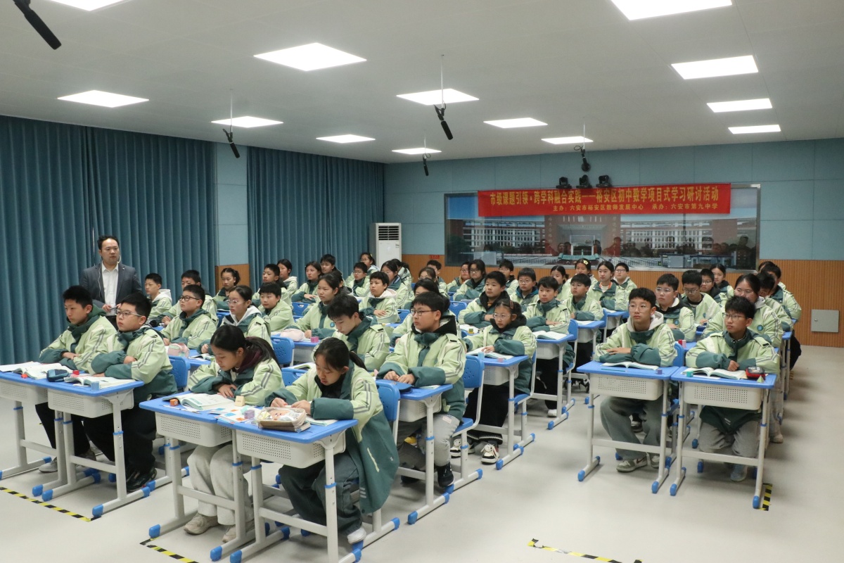 为深入推进市级课题《初中数学跨学科项目式学习活动设计与实践研究》的阶段性成果落地,探索数学核心素养的课堂培育路径,12月9日,在六安九中“教学研究月”第四期活动期间,裕安区初中数学项目式学习教学研讨活动成功举办。本次活动由裕安区教师发展中心主办,六安九中承办,全区各初中数学教师代表参与活动,活动以“示范课展示+专题点评+集体研讨”的形式,聚焦“跨学科素材与数学课堂的精准融合”展开深度交流。
