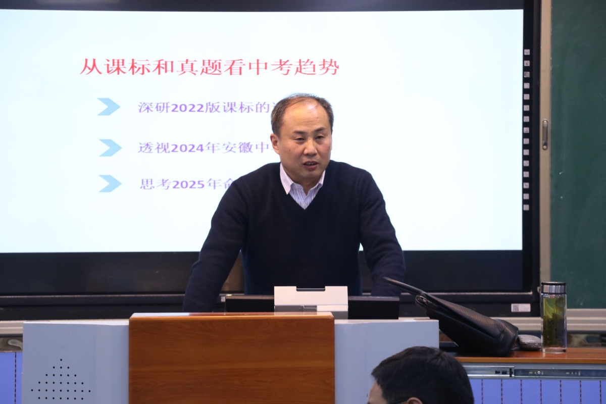 全国实验教学能手、安徽省课题研究先进个人、安徽省课改先进个人、合肥师范学院客座教授刘亮荣作《洞悉规律·高效备考》专题报告,从2024年真题评述切入,解析中考命题原则与趋势,提出“以课标为纲、以真题为鉴、以学情为基”的复习建议。讲座内容直击备考痛点,助力教师明晰方向,全组教师表示将聚焦主干知识、强化解题思维,以更高效的教学策略助力学生冲刺中考。