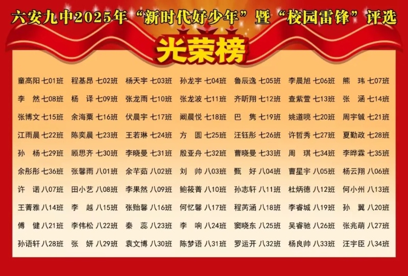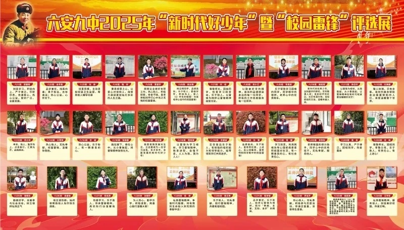 为积极培育和践行社会主义核心价值观,助力青少年“扣紧人生首粒纽扣”,积极营造创建全国文明城市的优良社会环境,培育德智体美劳全面发展的社会主义建设者和接班人,六安九中近期举办了2025年“新时代好少年”及“校园雷锋”评选活动。