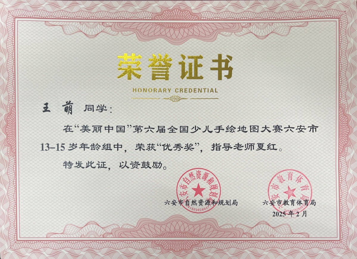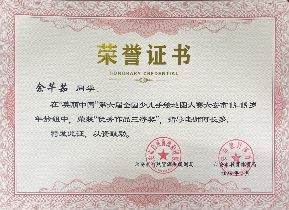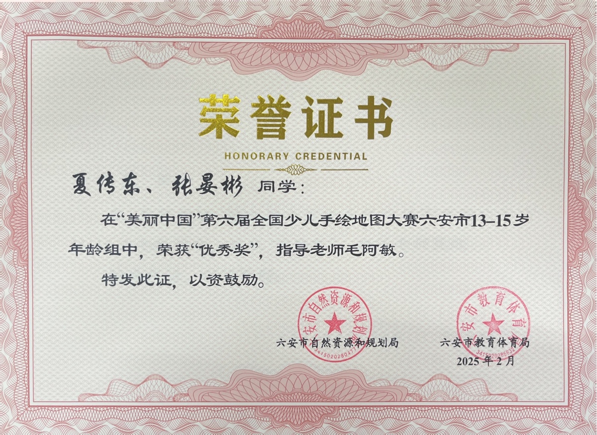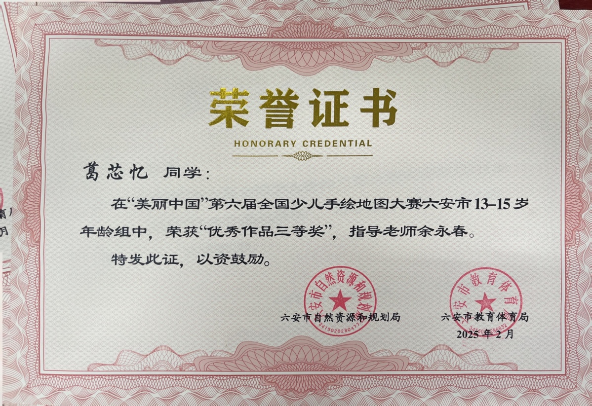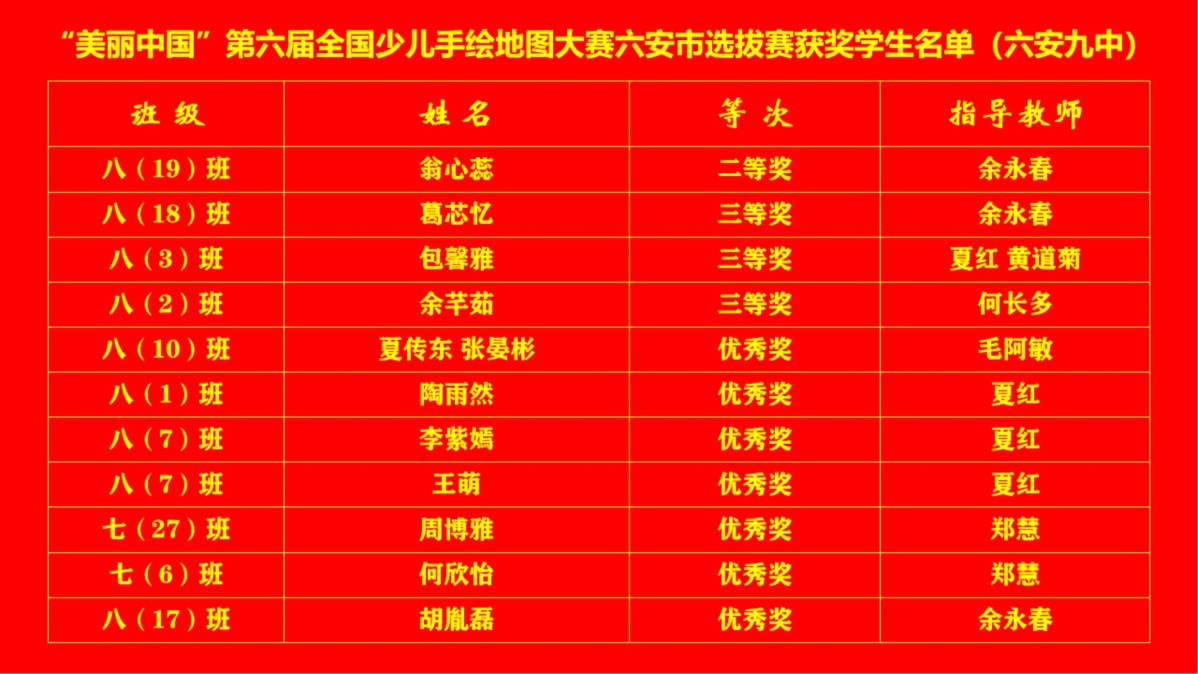近日,在“美丽中国”第六届少儿手绘地图大赛中,我校师生喜获佳绩,学校安徽赛区优秀组织奖、六安市选拔赛优秀组织奖。其中,八(19)班翁心蕊同学荣获二等奖;八(18)班葛芯忆、八(3)班包馨雅、八(2)班余芊茹同学荣获三等奖,八(10)班夏传东、张晏彬,八(1)班陶雨然,八(7)班李紫嫣,八(7)班王萌,七(27)班周博雅,七(6)班何欣怡,八(17)班胡胤磊同学荣获优秀奖;余永春、何长多、夏红、黄道菊老师荣获优秀指导教师奖。