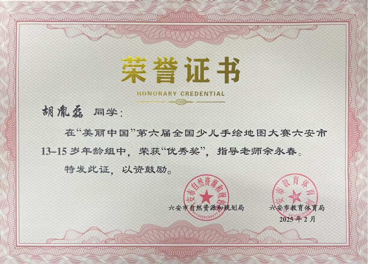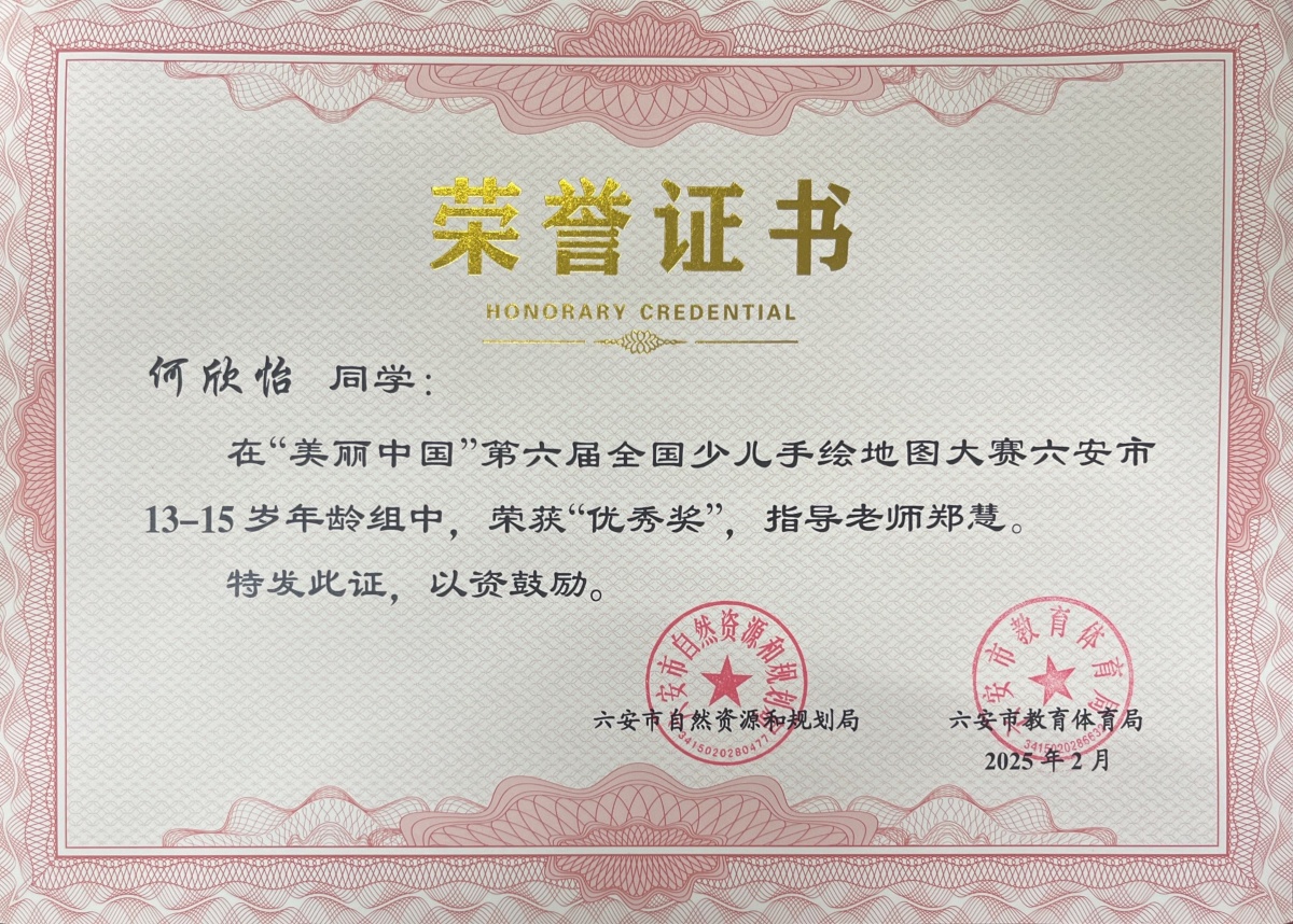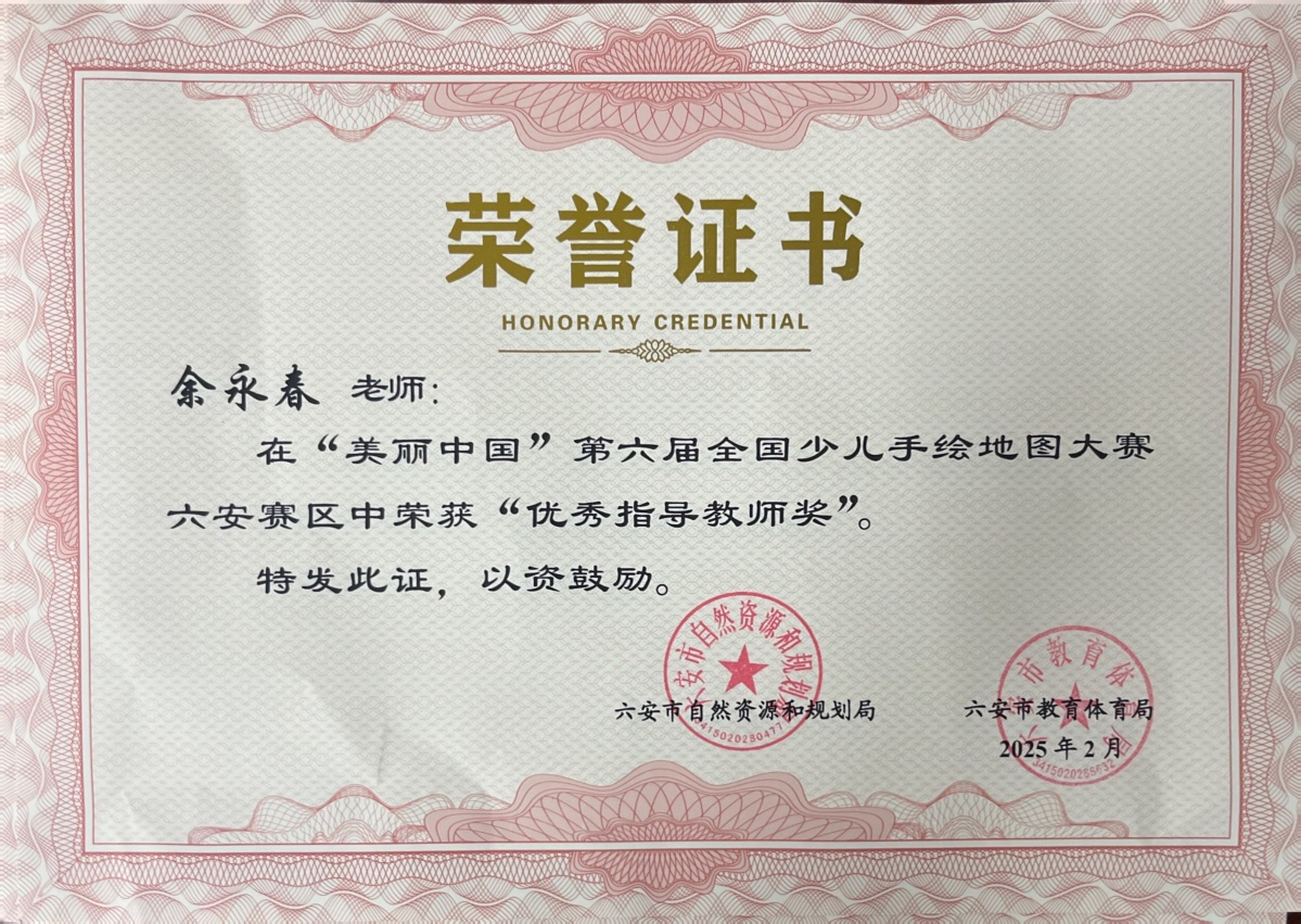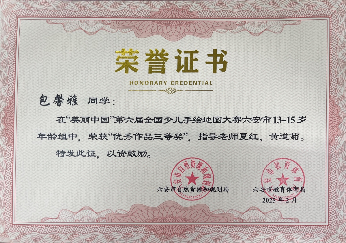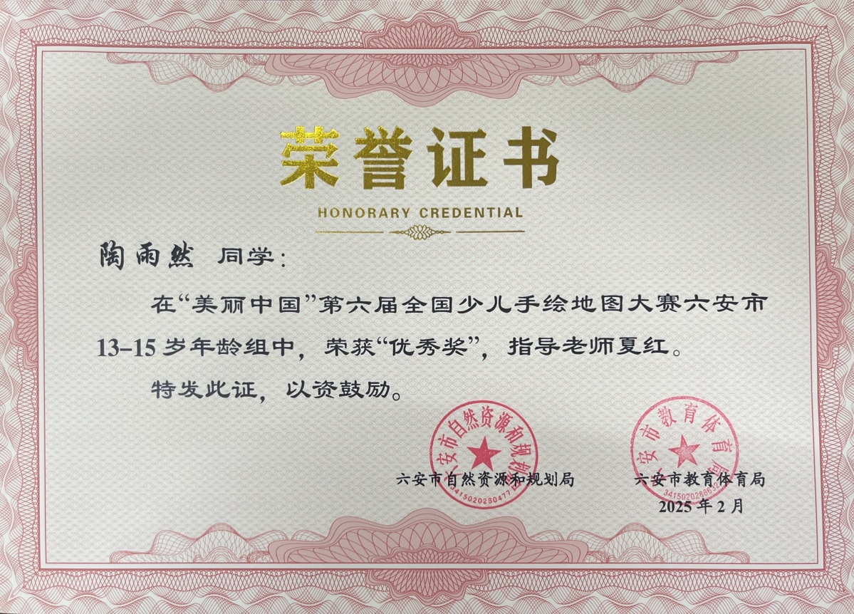 近日,在“美丽中国”第六届少儿手绘地图大赛中,我校师生喜获佳绩,学校安徽赛区优秀组织奖、六安市选拔赛优秀组织奖。其中,八(19)班翁心蕊同学荣获二等奖;八(18)班葛芯忆、八(3)班包馨雅、八(2)班余芊茹同学荣获三等奖,八(10)班夏传东、张晏彬,八(1)班陶雨然,八(7)班李紫嫣,八(7)班王萌,七(27)班周博雅,七(6)班何欣怡,八(17)班胡胤磊同学荣获优秀奖;余永春、何长多、夏红、黄道菊老师荣获优秀指导教师奖。