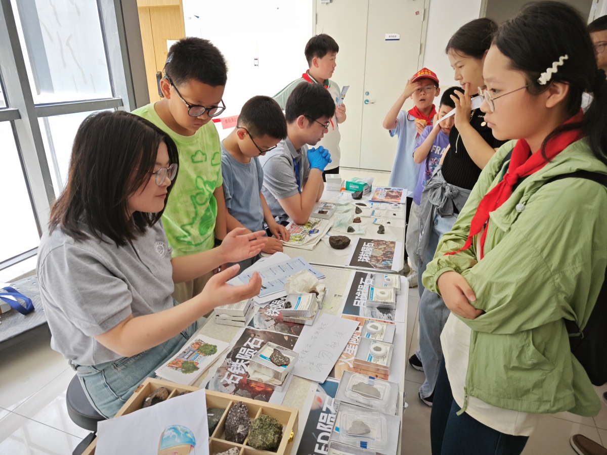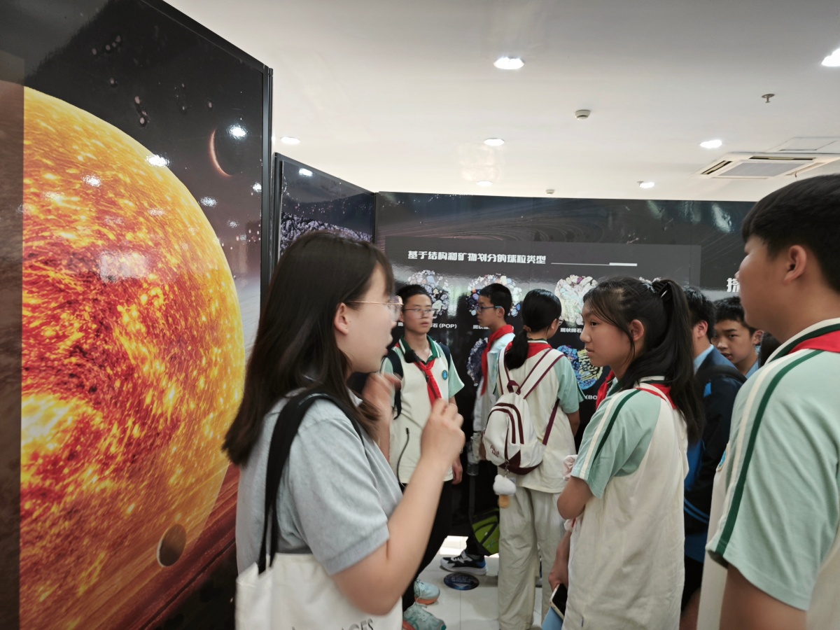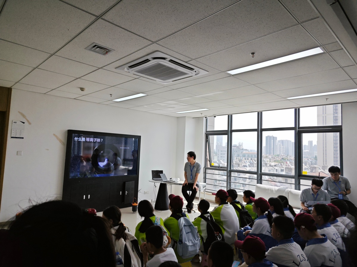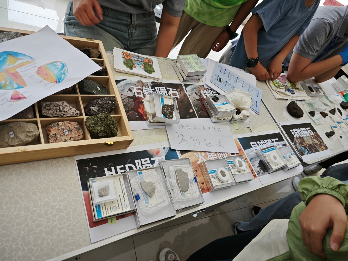 研学首站,学生们踏入地空学院——地物科普点。“球粒陨石是太阳系的原始记忆”,当普通球粒陨石与无球粒陨石并置时,一位同学感叹:“仿佛看到了46亿年前星云尘埃的跃动。”等离子体实验室的蓝光更是令人震撼——电离的甲烷云团在装置中翻涌,模拟土星大气环境;太阳风模拟器中,银白色等离子束随磁场舞动,宛如“触碰到太阳的呼吸”。