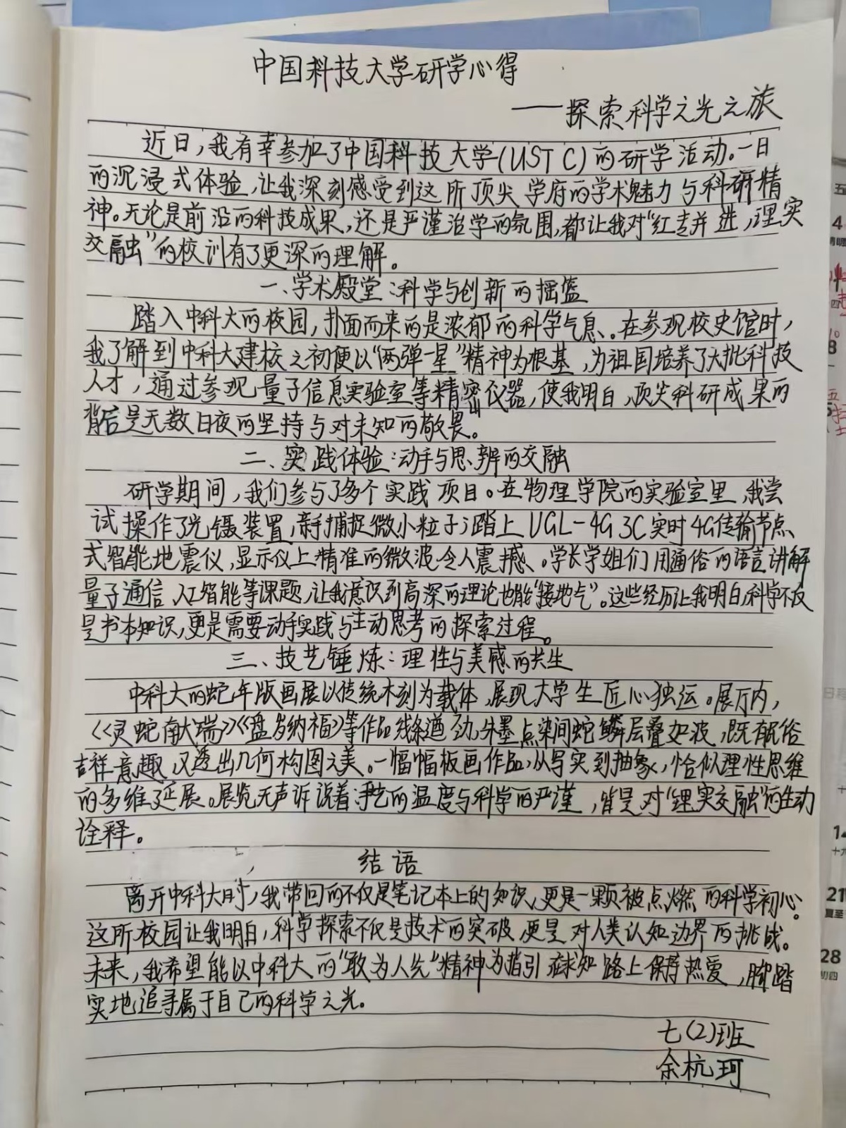 此次研学活动,在我校青少年的心中播下了一颗热爱科学的种子。未来,他们将以中科大人的“敢为人先”精神为指引,秉承“厚德、立人、笃学、成才”的九中校训,以今日所见所感为基石,在追寻真理的道路上砥砺前行,共筑民族复兴的科技梦想!
