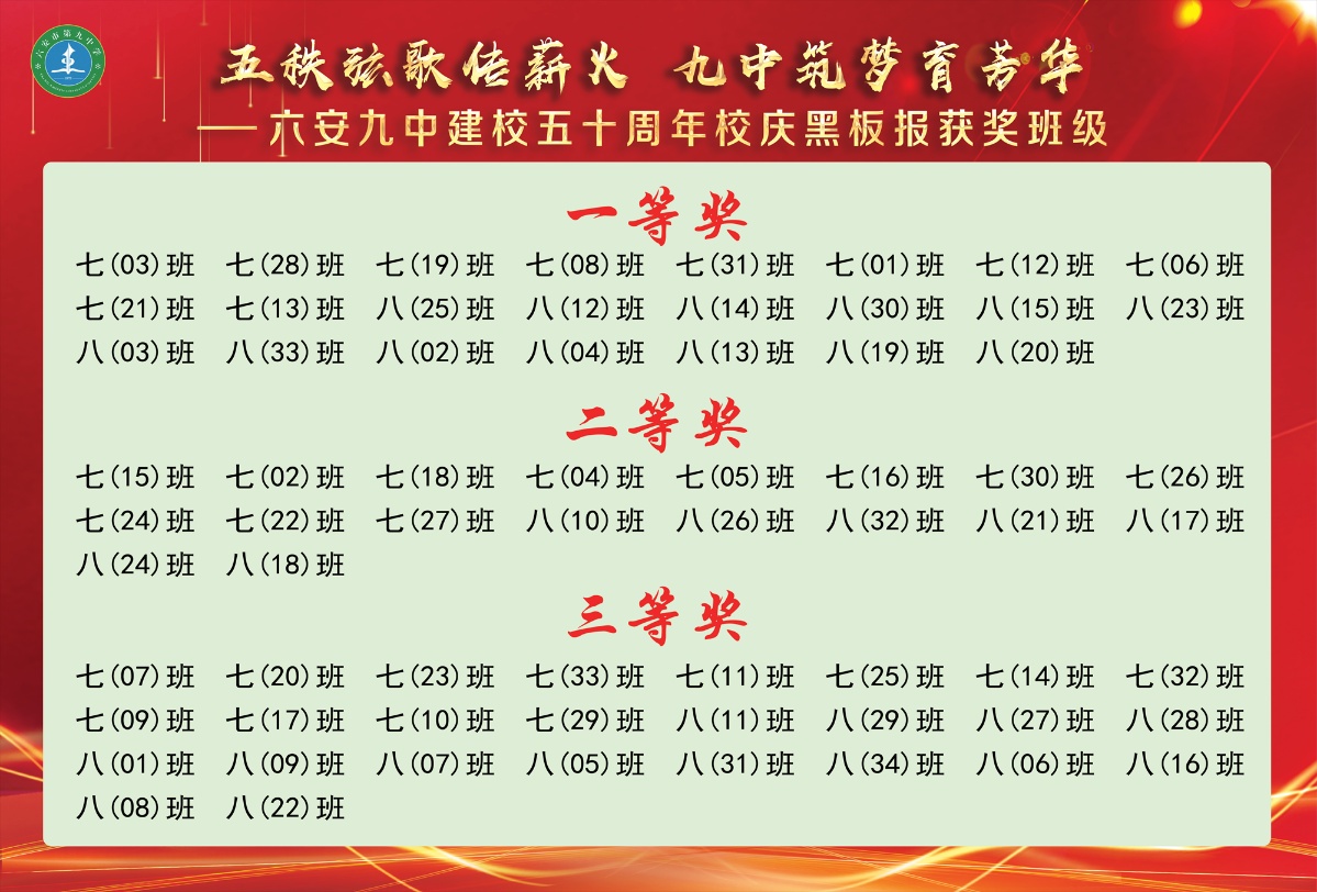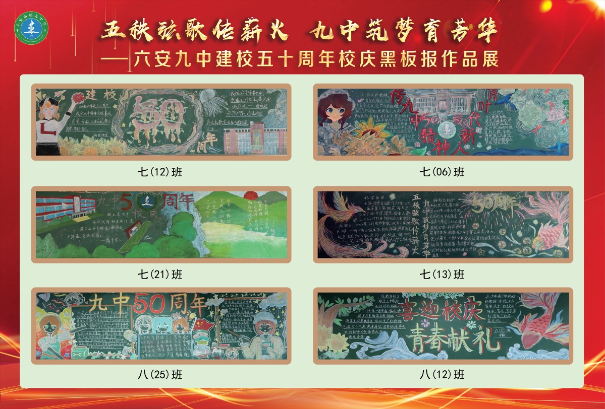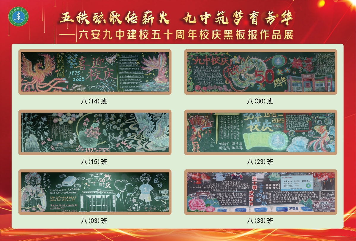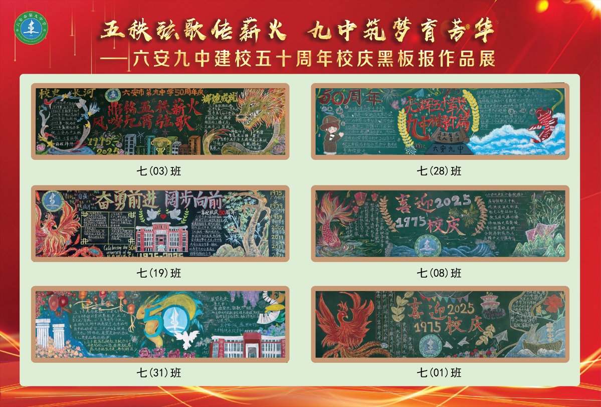 七(21)班“门启芳华”中巍峨的朱红校门,是五秩春秋的时光扉页;层叠的绿意藤蔓,是少年以根为笔的生长宣言。七(13)班“凤舞鲤跃”中展翅的鎏金凤凰,是九中五秩涅槃的烈焰图腾;腾跃的赤鳞锦鲤,是学子笃志前行的清波勋章。