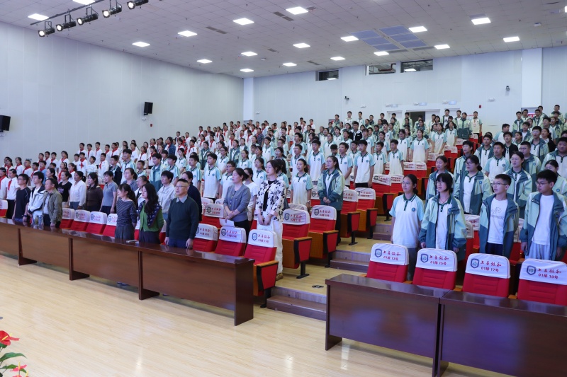 伴随着雄壮的《义勇军进行曲》,全体师生肃立注目,齐唱国歌。这一刻,每个人的脸上都写满了庄严与自豪。礼堂灯光的照耀下,歌声回荡,五星红旗在每个人心中飘扬,九中人昂扬向上的精神风貌也在这一刻具象化。