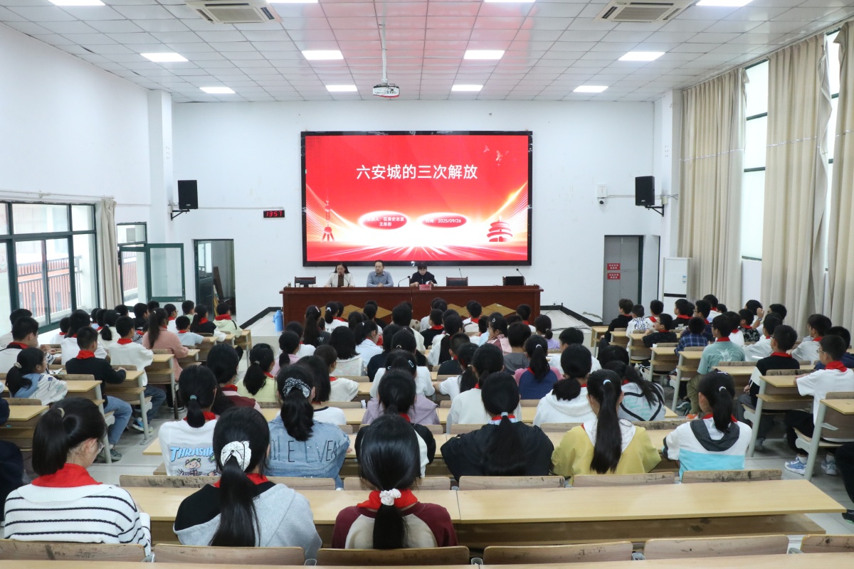 为了深化青少年党史教育,传承红色基因,9月26日下午,六安九中携手裕安区委史志室,共同举办了一场以“六安城的三次解放”为主题的宣讲活动。此次活动特邀裕安区委史志室研究员王彤彤老师担任主讲人,通过历史脉络梳理与革命故事讲述,为九中的少先队员们带来了一场深刻而生动“红色思政课”。