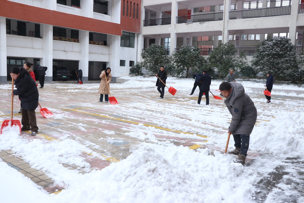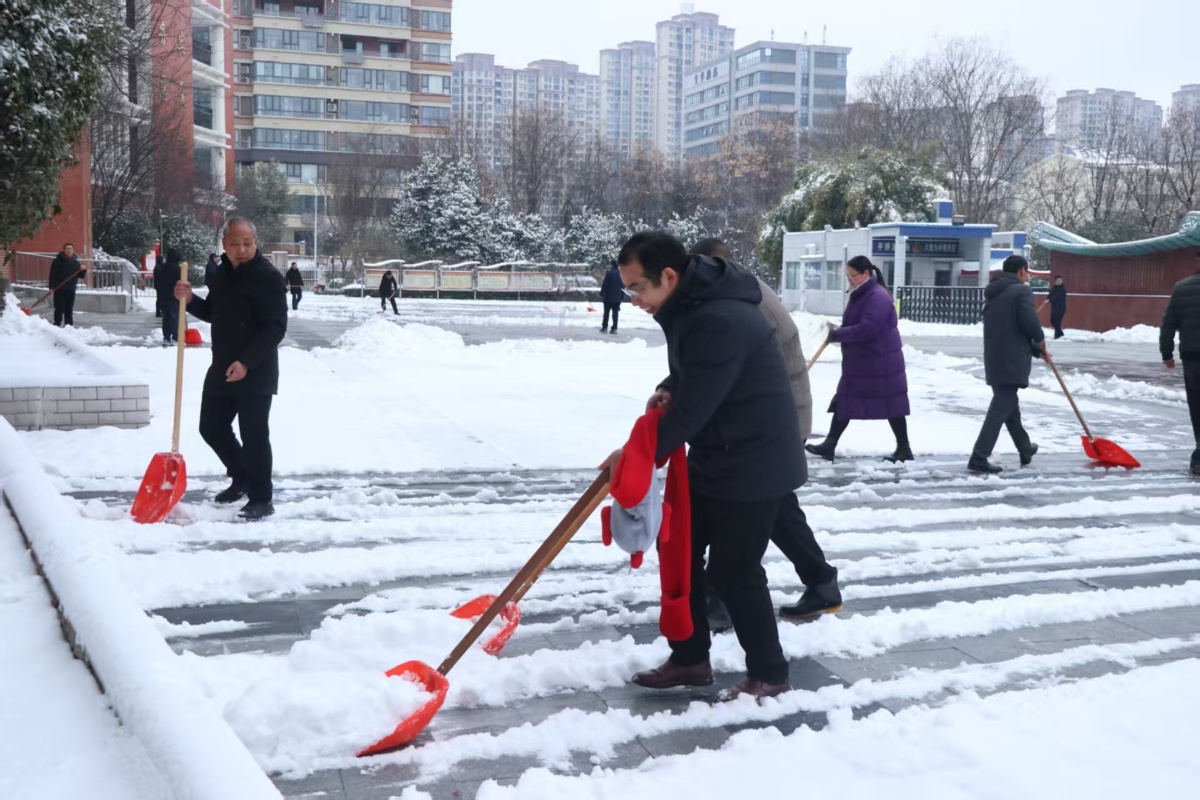“以雪为令,党员先行”,学校党委发出号召,吹响了铲雪除冰的“集结号”。全体党员教师闻令而动,冒着零下低温,踩着积雪坚冰,带着铁锹和扫帚,迅速集结在校园广场、各主要通道、教学楼、停车场等关键区域。大家分工明确、配合默契、干劲十足。有的挥舞铁锹破冰铲雪,有的手持扫帚清扫残雪,有的合力搬运堆积的雪堆,现场一派热火朝天的劳动景象。尽管寒风凛冽、双手冻得通红,但党员教师们的热情丝毫不减,脸上洋溢着实干的笑容,铁锹与地面的碰撞声、此起彼伏的吆喝声,汇成冬日里最温暖的旋律,构成了校园里一道最美的冬日风景线。