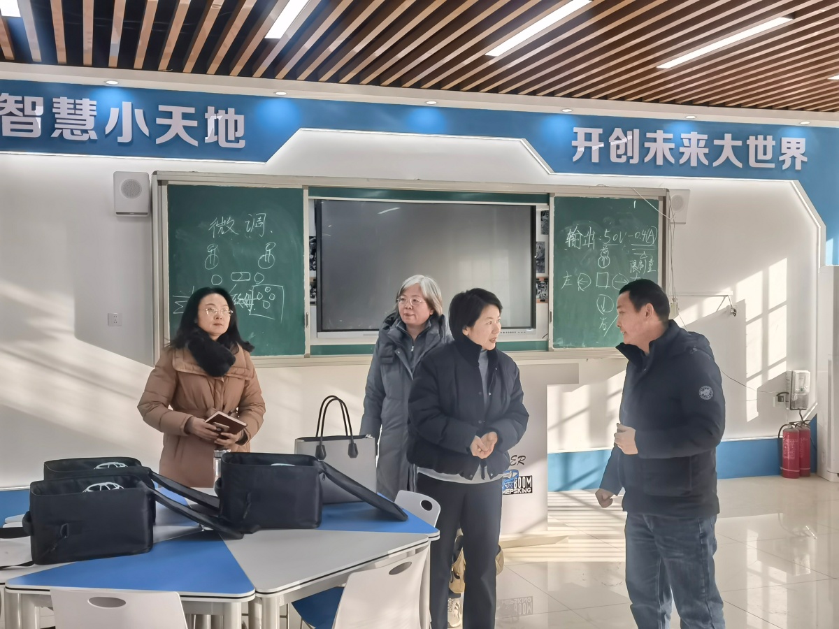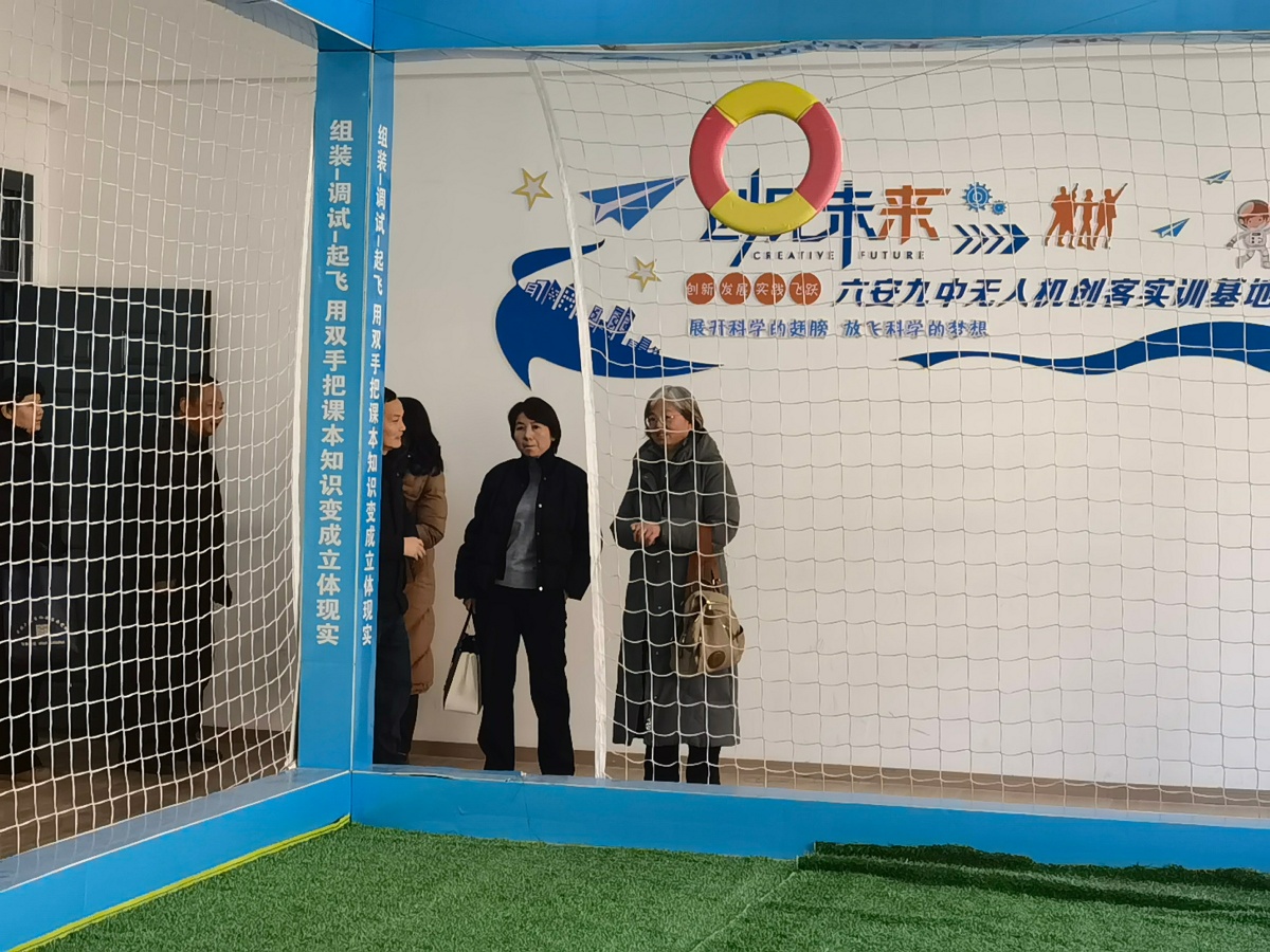 陈月圆一行先后走进各科创功能场馆,仔细查看了实验室设备配置、场地布局及日常使用情况,认真聆听了相关负责人关于科创课程开设、社团活动开展、赛事成果等方面的汇报。在小平科技创新实验室,陈月圆一行驻足观看机器人的操作演示与科创作品展示,详细询问设备维护、耗材保障等细节;在无人机足球场馆,了解到我校学生在全国无人机大赛、世界机器人大赛等赛事中屡获佳绩,且学校获评“全国航空特色学校”时,给予了高度评价;在创客教室,对我校将科普教育与实践创新深度融合的做法表示认可,认为这种模式有效激发了学生的科学探究热情。
