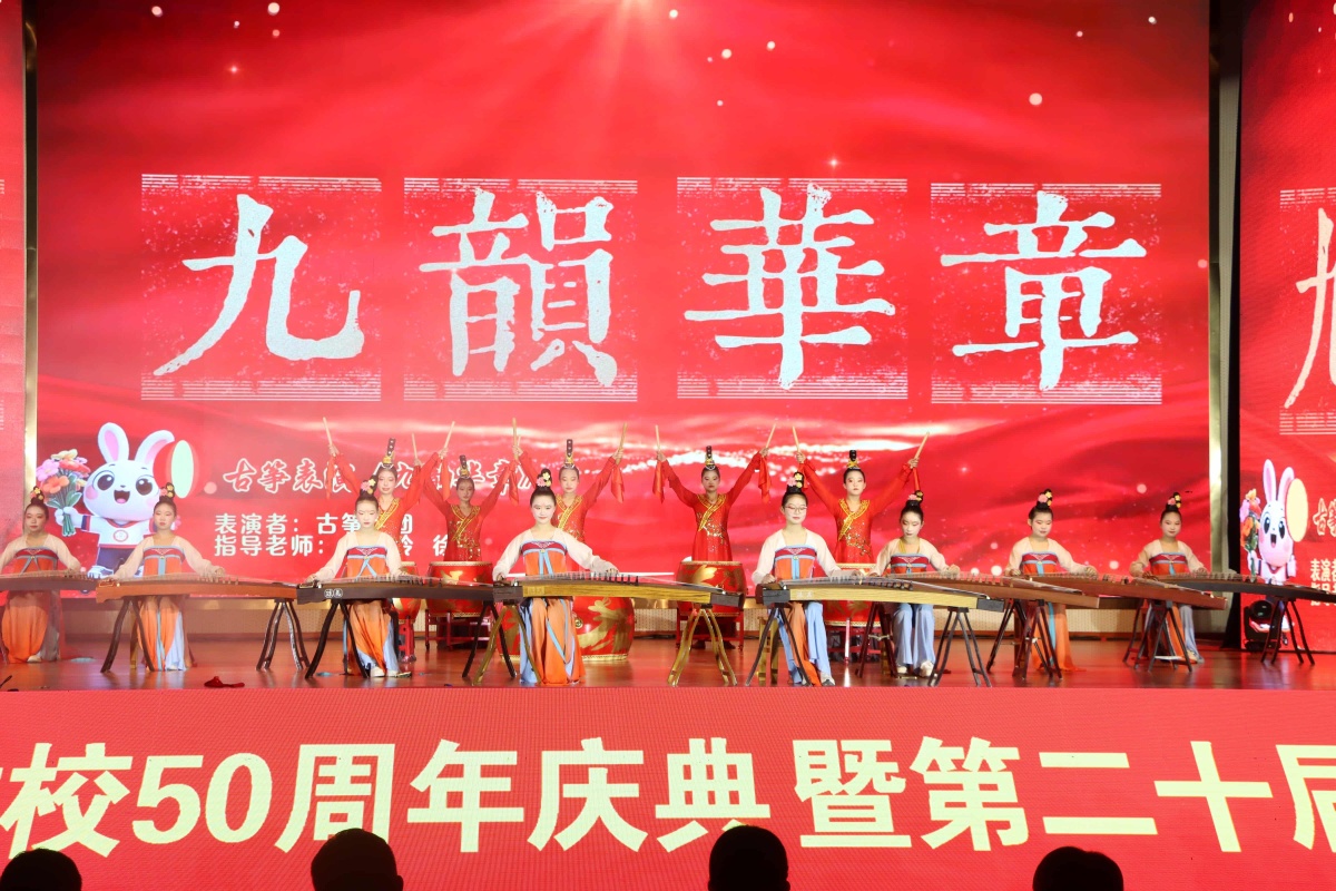 古筝表演《九韵华章》,弦音铿锵,旋律激昂,同学们用高超的技艺、纯熟的演奏向校庆献礼。