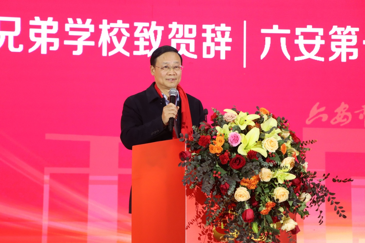 六安一中党委书记、校长经怀德代表兄弟向六安九中全体师生和海内外校友表示热烈祝贺。六安九中是六安一中优质生源基地校,五十年来,两校守望相助,情谊深厚。贺辞中,经怀德高度赞扬了六安九中在特色办学、内涵发展、培育人才等方面取得的辉煌成绩,祝愿六安九中赓续五十年的荣光,在新时代教育征程上,续写更加璀璨的育人华章。