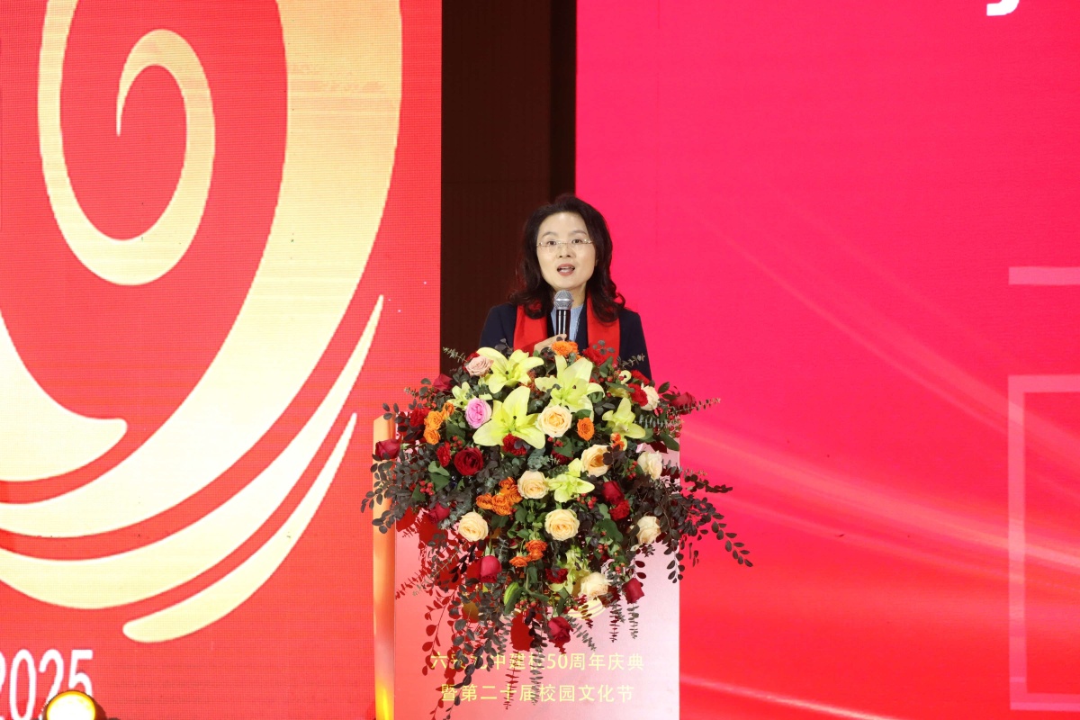 六安九中党委书记李艳致欢迎辞。致辞中,李艳向莅临庆典活动的领导、嘉宾及校友代表表示热烈的欢迎,深情回顾了我校50年的辉煌历程,擘画了我校未来的发展蓝图。六安九中五十年的发展历程,是一幅实干奋斗的壮美画卷,是一首传承精神的交响乐章,更是一张硕果璀璨的教育名片。李艳表示,六安九中将以此次庆典活动为契机,持续秉持“培养合格的人,塑造特长的才”的办学理念,以“建设幸福和谐的现代化精品学校”为发展目标,聚力打造核心素养的高效课堂,实施名师培养升级工程,构筑五育融合育人生态,推进教育数字化提升行动,营造幸福和谐人文氛围,发挥品牌学校示范效应,加速推进学校精品化发展,为教育强区战略添光增彩,为中国式现代化强国建设贡献九中的智慧和力量。